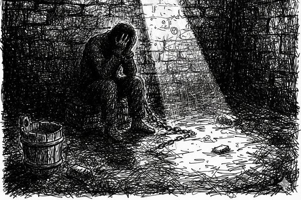 A slit in the door, the sole lonely finger of the outside world, and two men divided by chains.